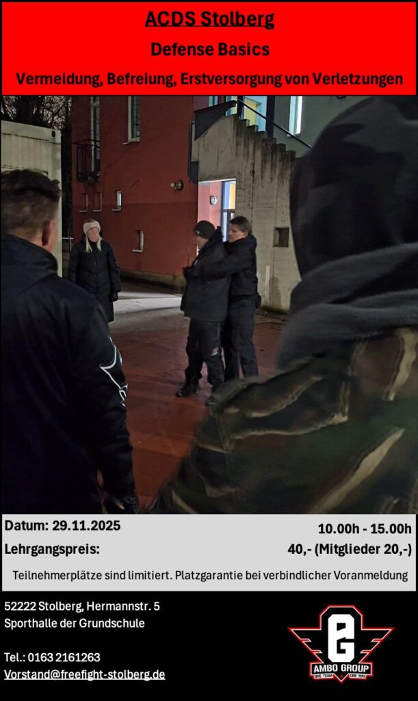 Selbstschutz in der dunklen Jahreszeit. Basic-Lehrgang Beitrags-Autor:Stefan Heinen Beitrag veröffentlicht:7. November 2025 Beitrags-Kategorie:Lehrgänge / Training Beitrags-Kommentare:0 Kommentare Schlagwörter: ACDS, Befreiung, dunkel, Erstversorgung, Freefight, realistische Selbstverteidigung, Selbstschutz, Veranstaltungen Weitere Artikel ansehen Vorheriger Beitrag3 Tage Braungurtprüfung Das könnte dir auch gefallen Selfdefense Basics Lehrgang am 27.09.2025 22. September 2025 Training in den Ferien 11. Juli 2025 Intensivlehrgang im Headquarter in Portugal 29. Juli 2025 Schreibe einen Kommentar Antwort abbrechenKommentarGib deinen Namen oder Benutzernamen zum Kommentieren ein Gib deine E-Mail-Adresse zum Kommentieren ein Gib deine Website-URL ein (optional) Meinen Namen, meine E-Mail-Adresse und meine Website in diesem Browser für die nächste Kommentierung speichern.